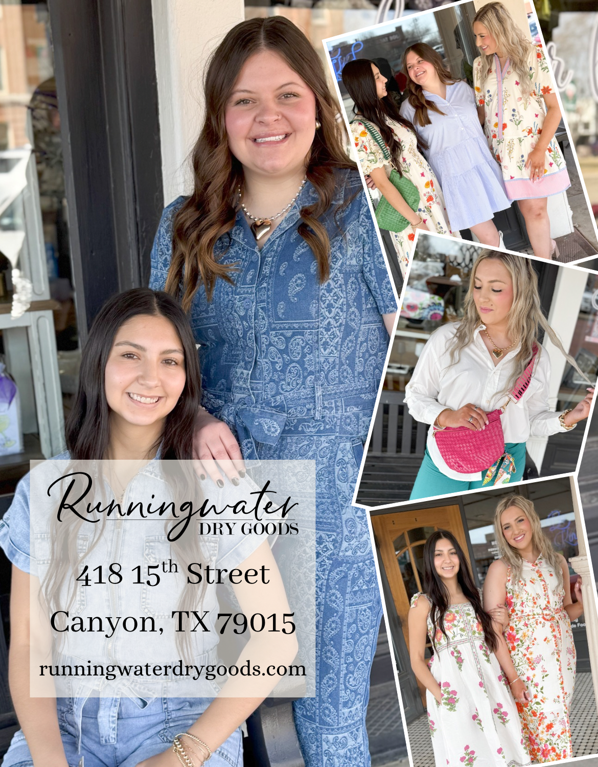 A premiere shopping experience on the Texas panhandle. Runningwater Dry Goods is a mother/daughter run boutique bringing the latest trends and timeless fashion to the Texas panhandle. Located on the historic square in Canyon, TX.