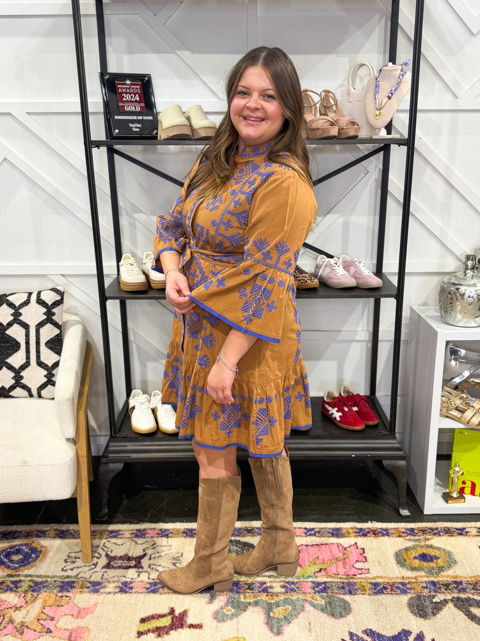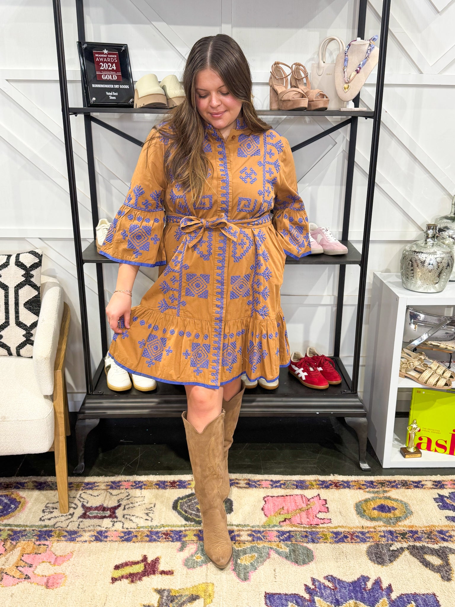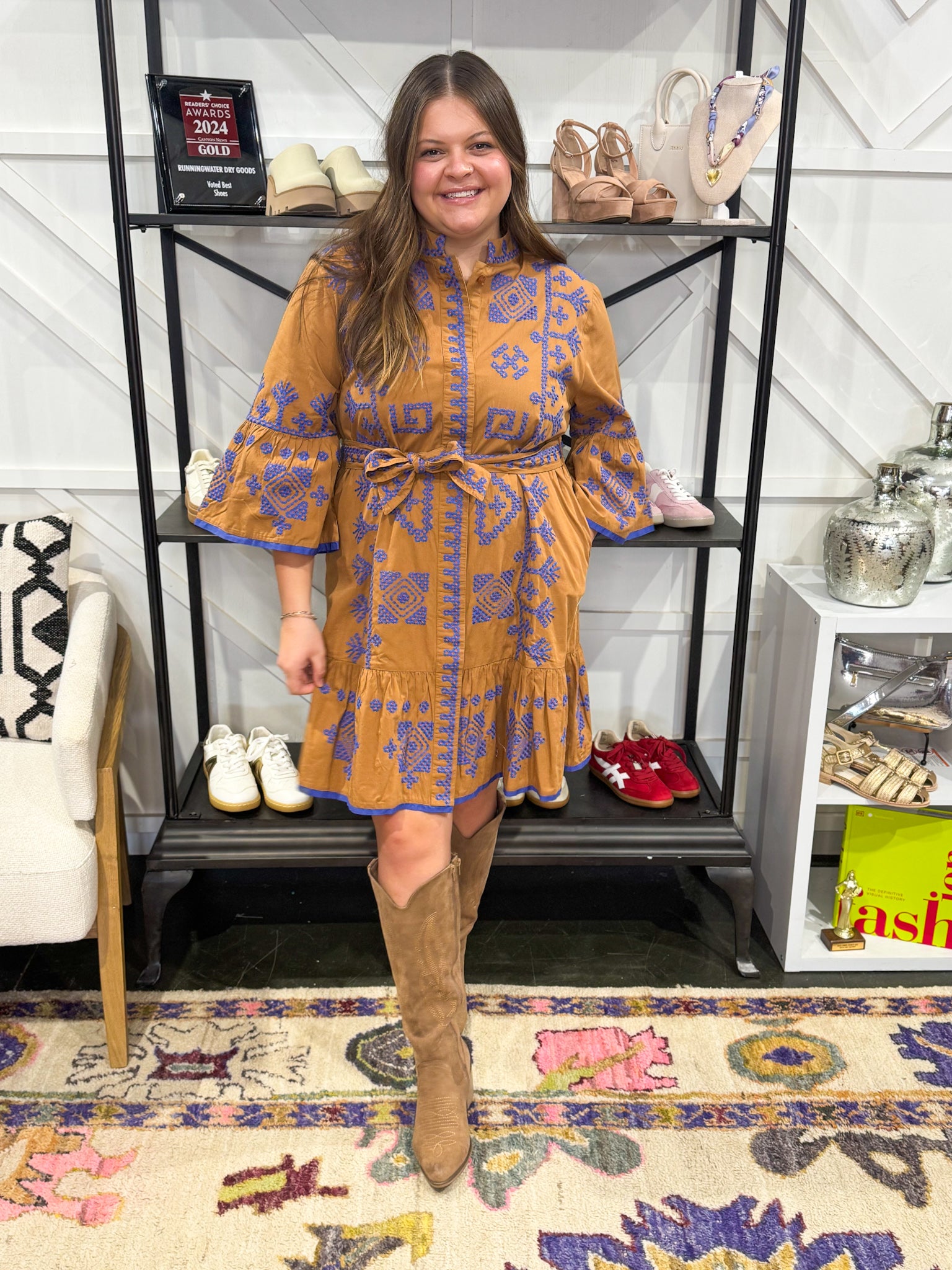 Brown dress that buttons up the front, has long sleeves, and ruffled hemline. The dress has stunning blue embroidered details all over the dress. The dress has a belt that ties at the waist. Model is wearing size medium.