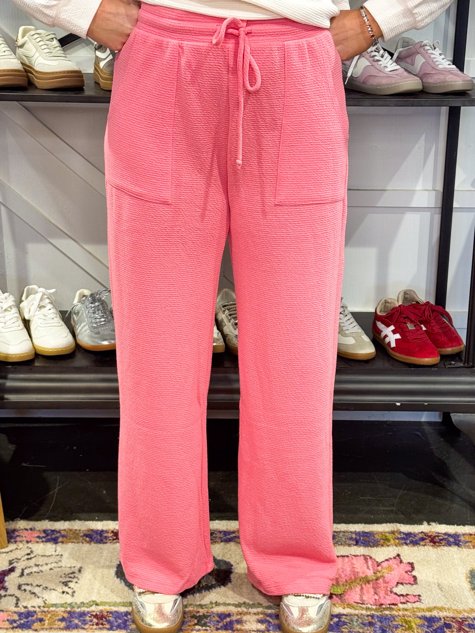 The softest knit bottoms with an elastic, drawstring waistband and tapered wide leg fit.