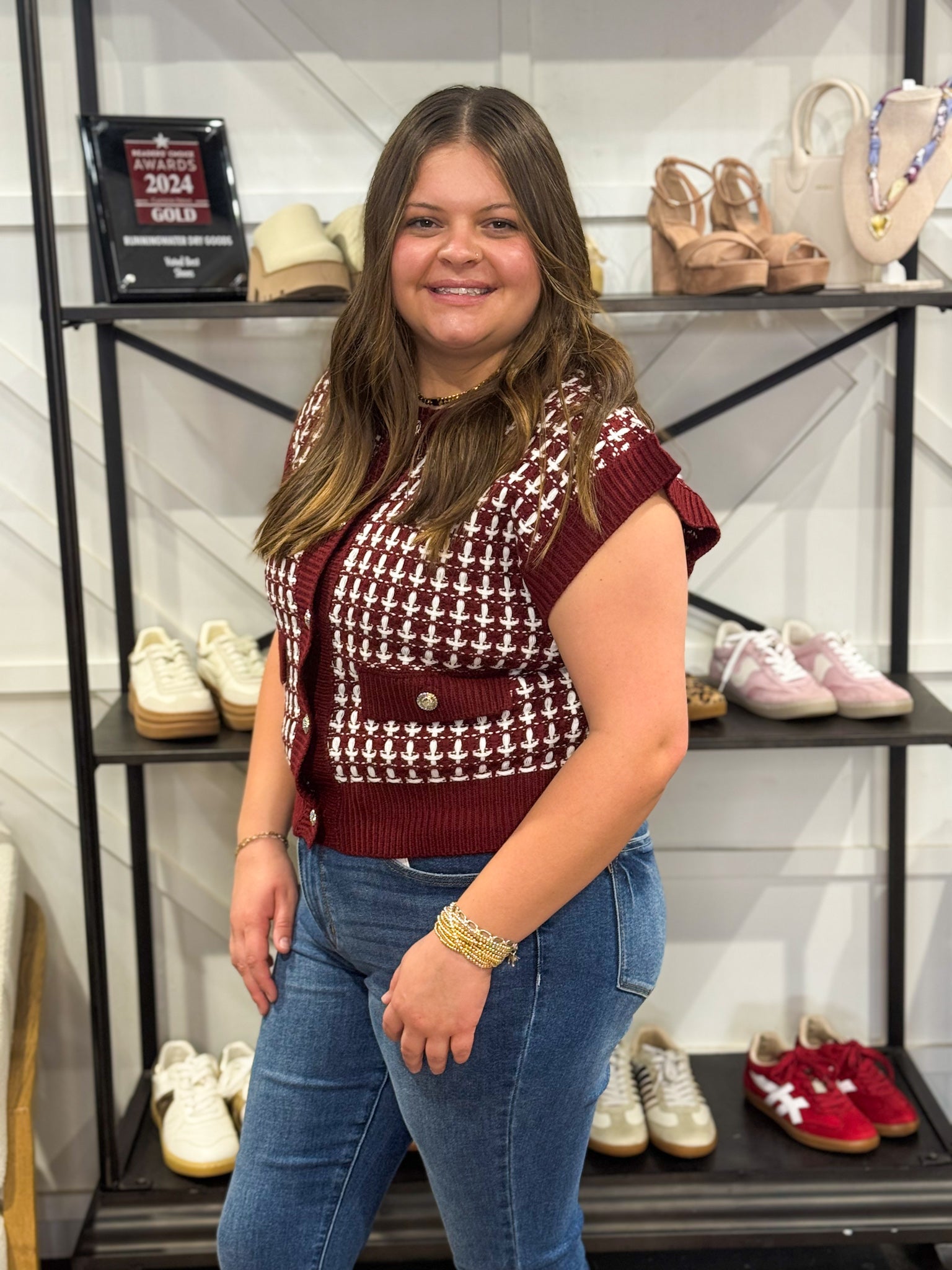 Maroon and white checkered sweater vest with capped sleeves, gold buttons up the front and pockets. Model is wearing size large.