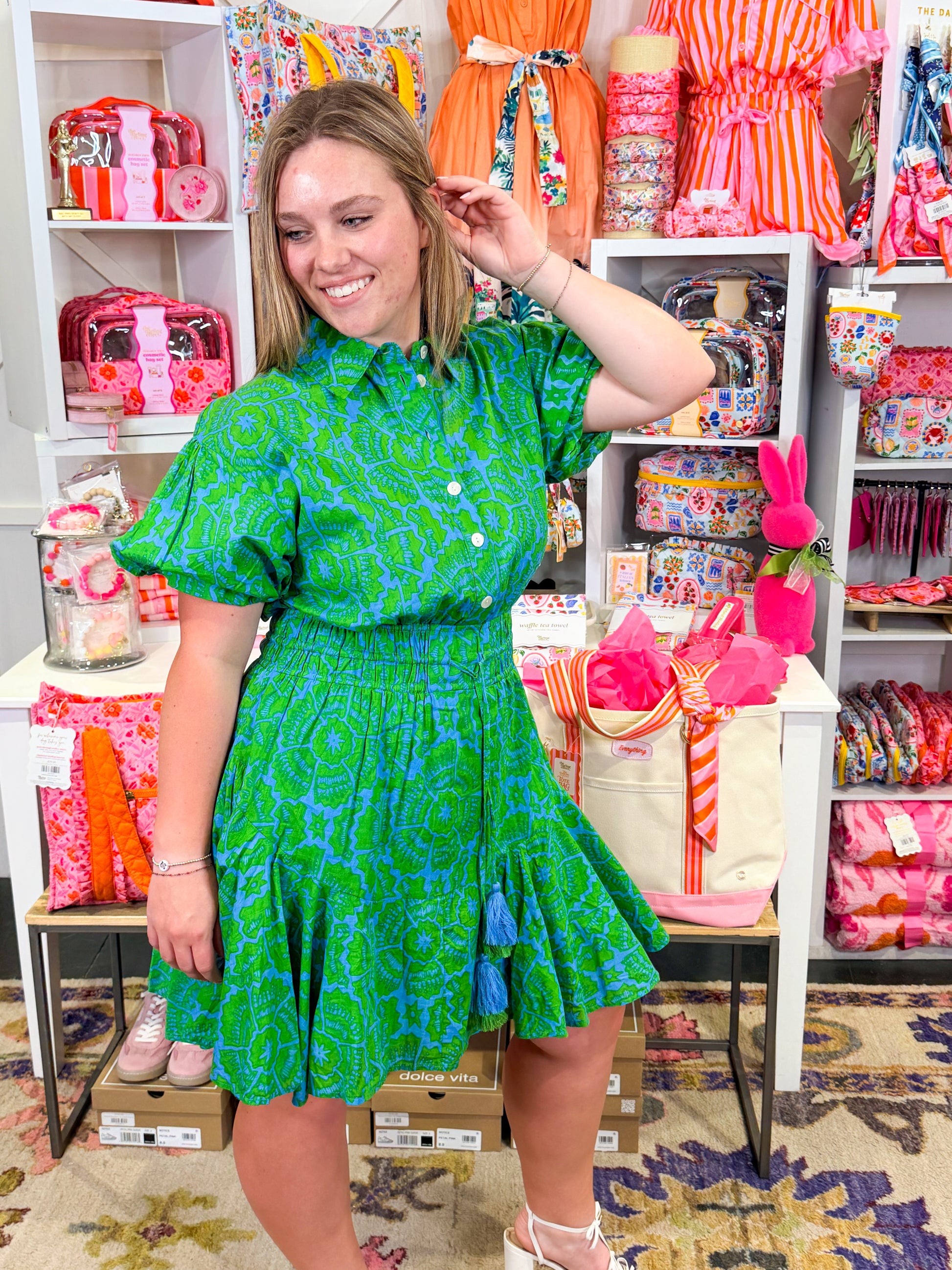 Green and blue floral printed dress. The dress has short sleeves and an elastic waistband. The dress has a flounced hemline and buttons up the front and has a collar detail. Model is wearing size large. Not sheer. Lined.