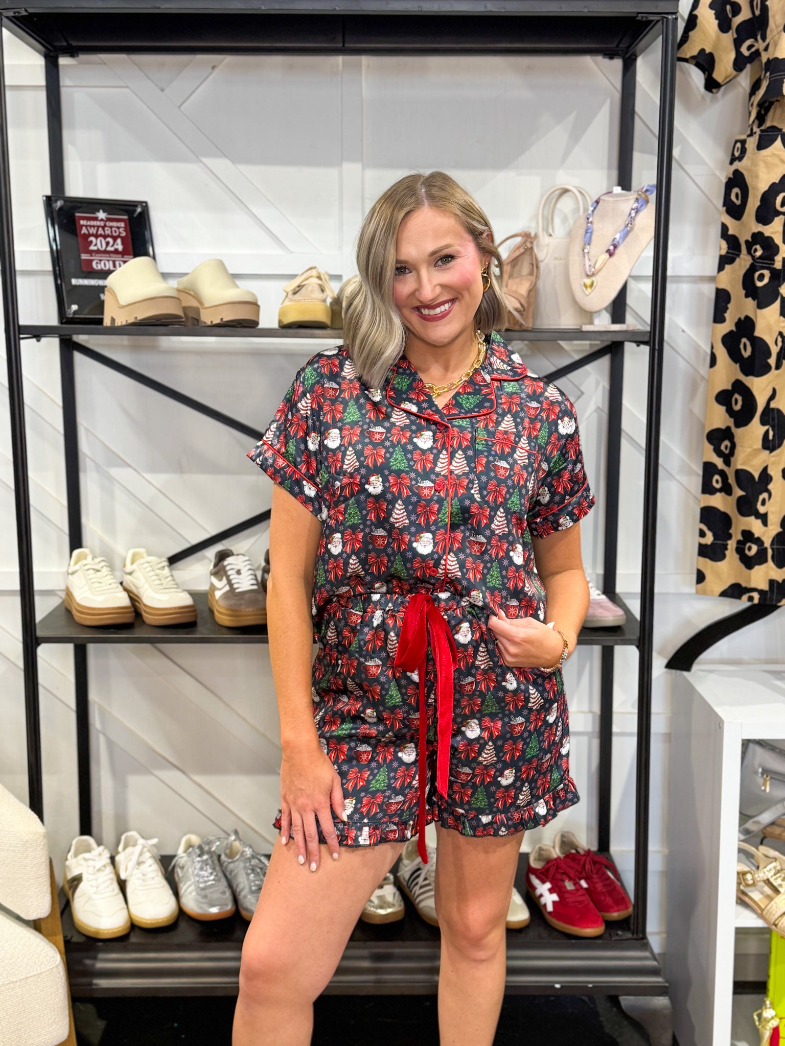 The classic little Debbie Christmas tree treats printed on PJs sets. The PJs are short sleeves with matching shorts. Model is wearing size large.