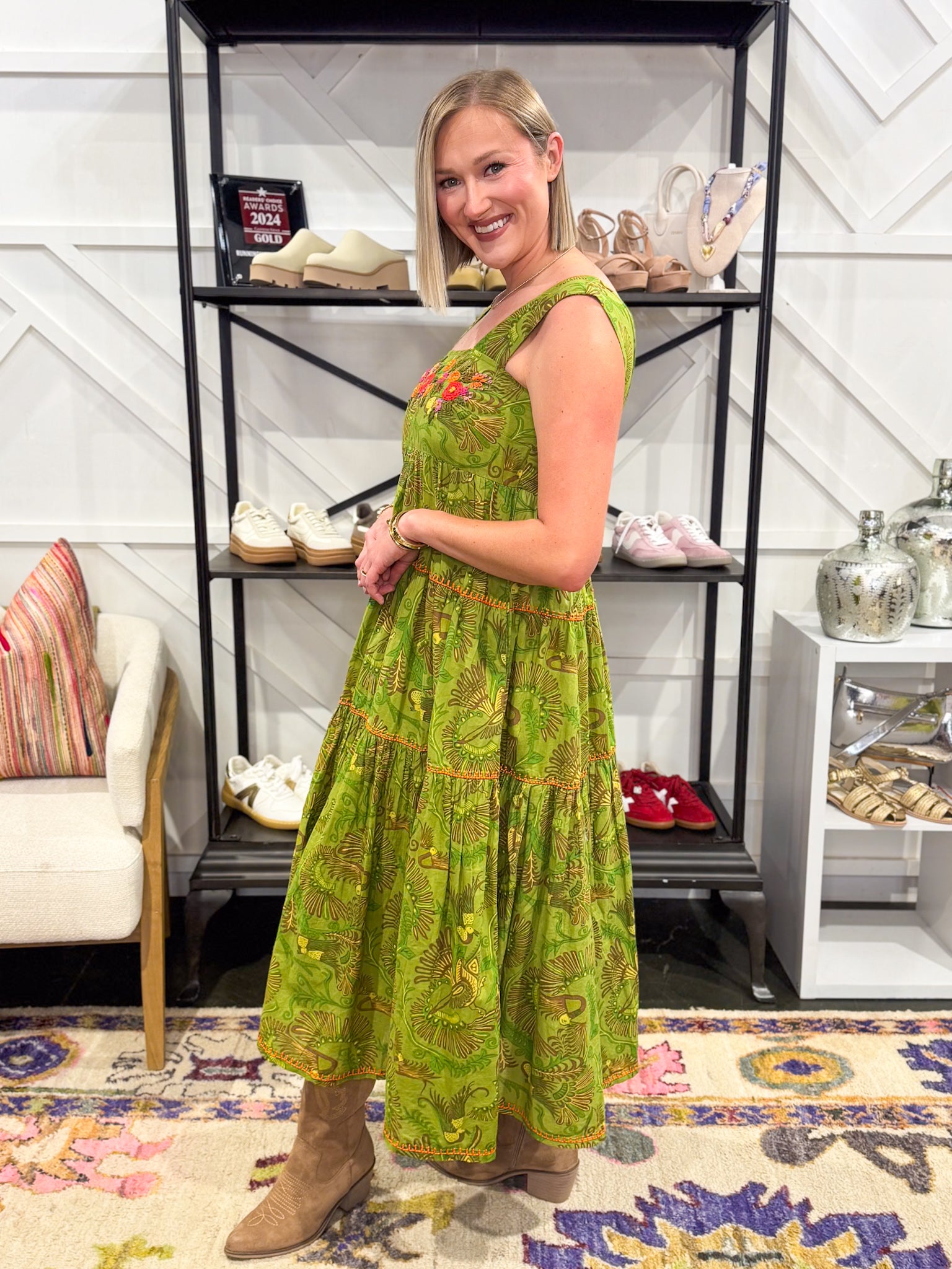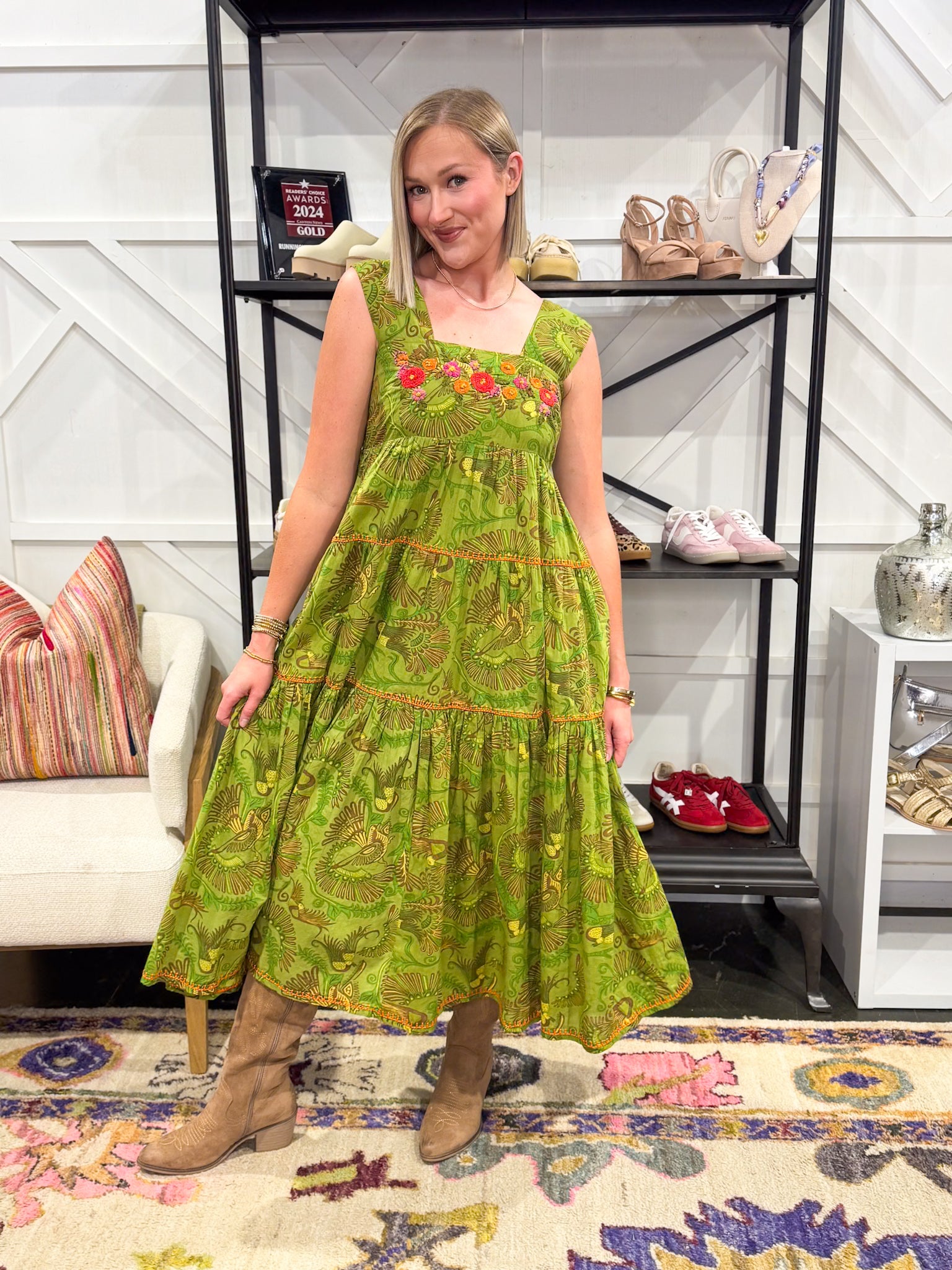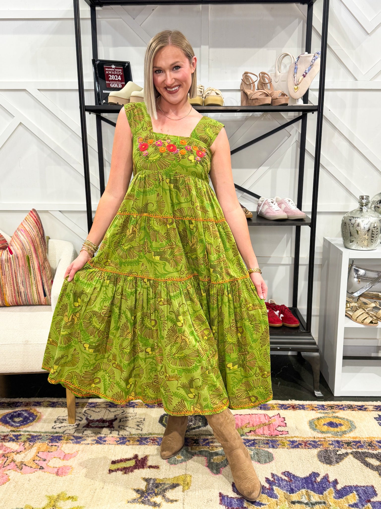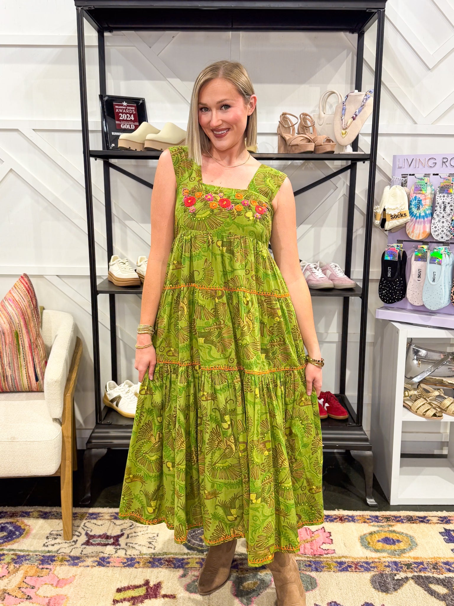 Gorgeous green floral printed dress with embroidered flowers at the top. The dress has tiered layers with orange stitching. Fit is true to size. Model is wearing size small.