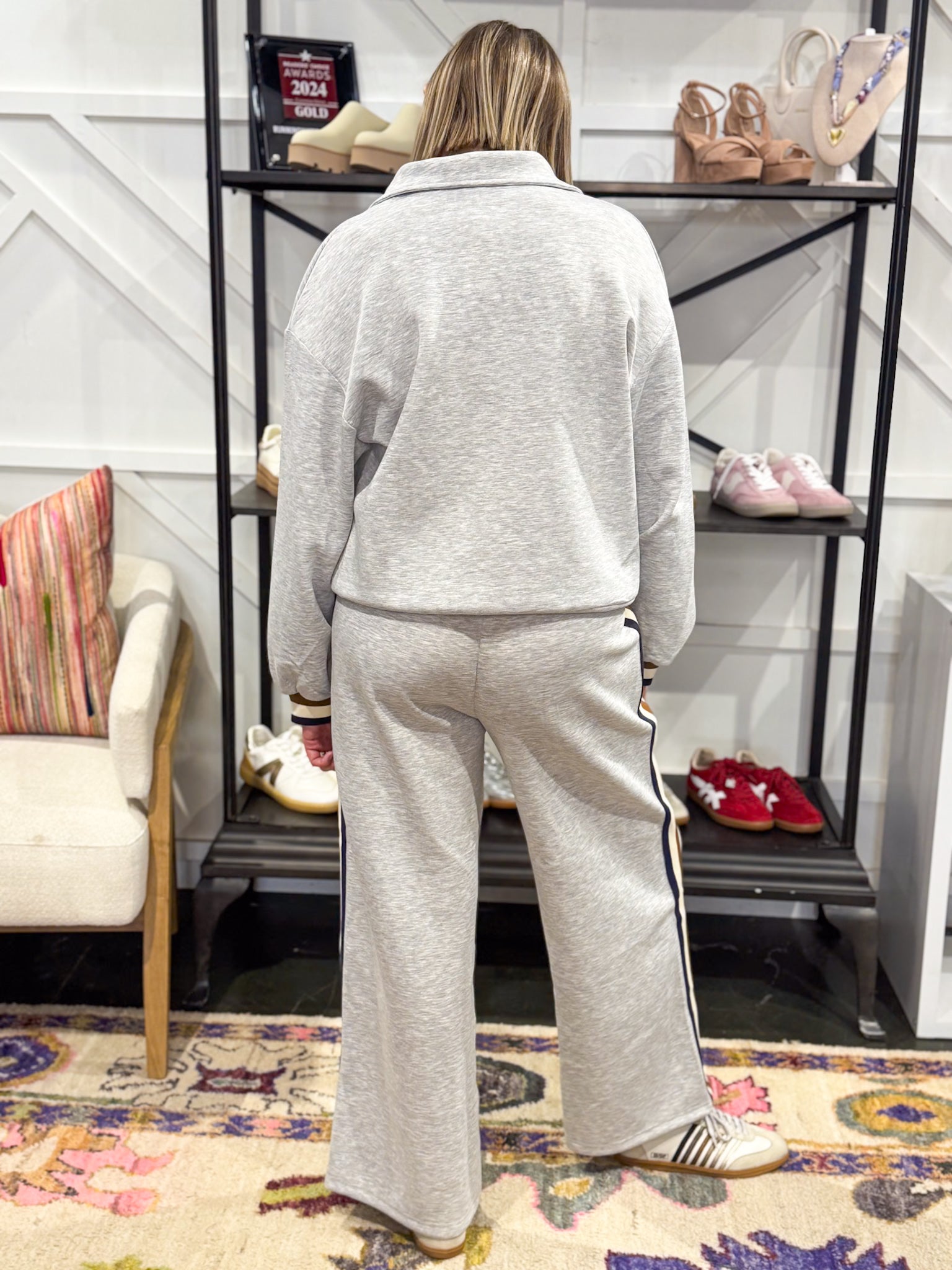 The perfect comfortable set for all of Fall. The set has a pullover and pants with striped details. Model is wearing size medium.