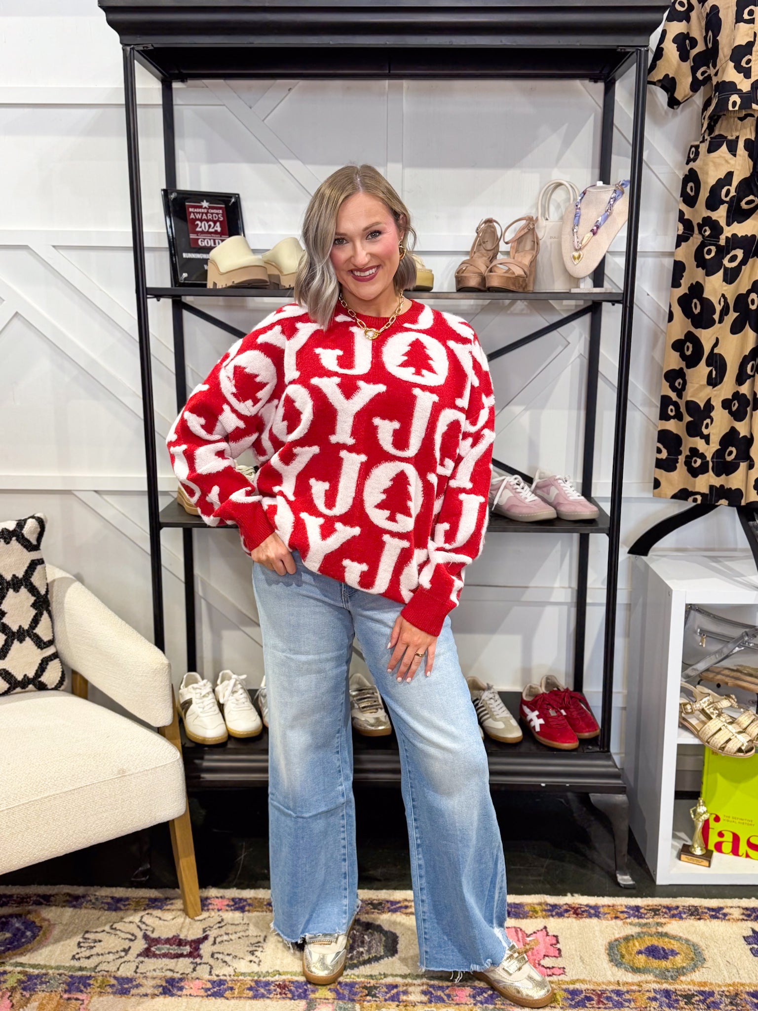 Vivid red sweater white white ‘Joy’ imprinted throughout the sweater in a 3D form. Model is wearing size large.