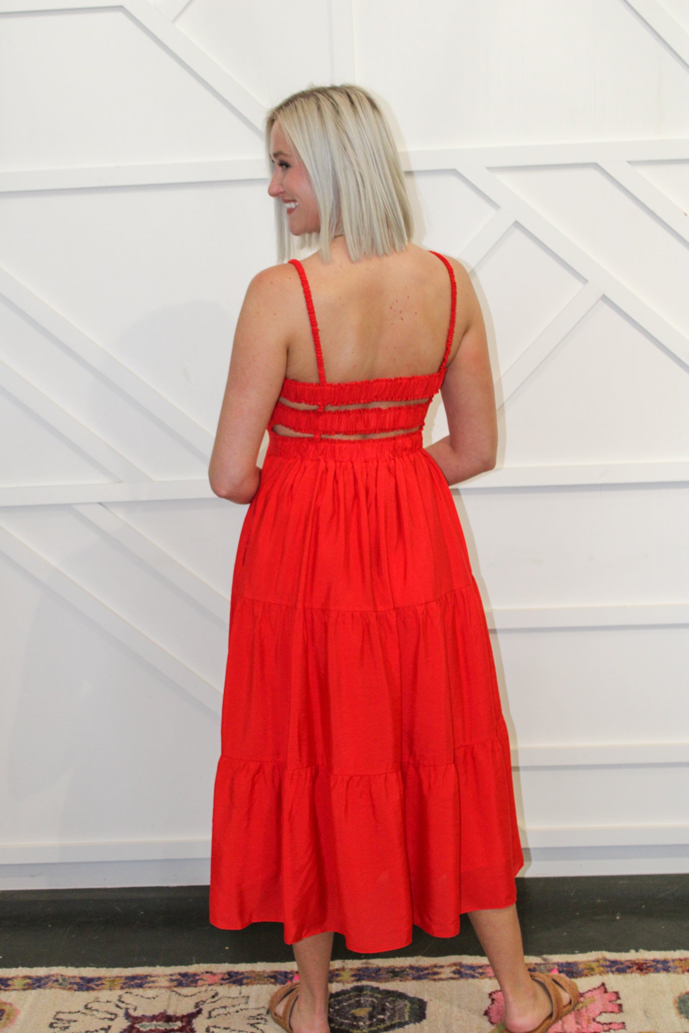A stunning & bold red midi dress with elastic straps and a cut out in the front and back. An easy dress to throw on when the temperatures warm up. Paired with sneakers or sandals. Model is wearing size medium.