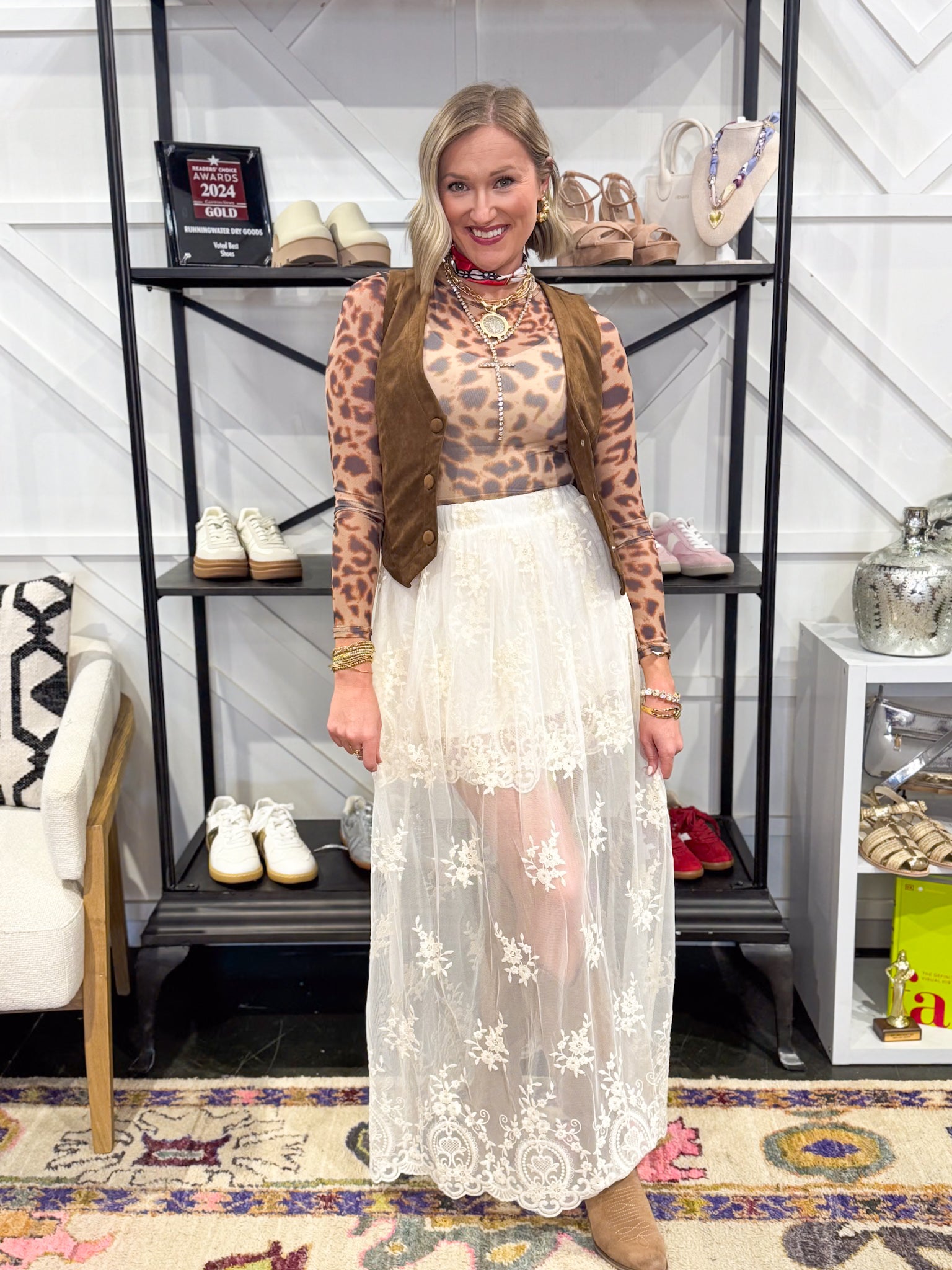 The most fun ivory maxi skirt that is sheer from the ankles to above the knee. It’s the perfect skirt to give any outfit a western flair. Model is wearing size medium.