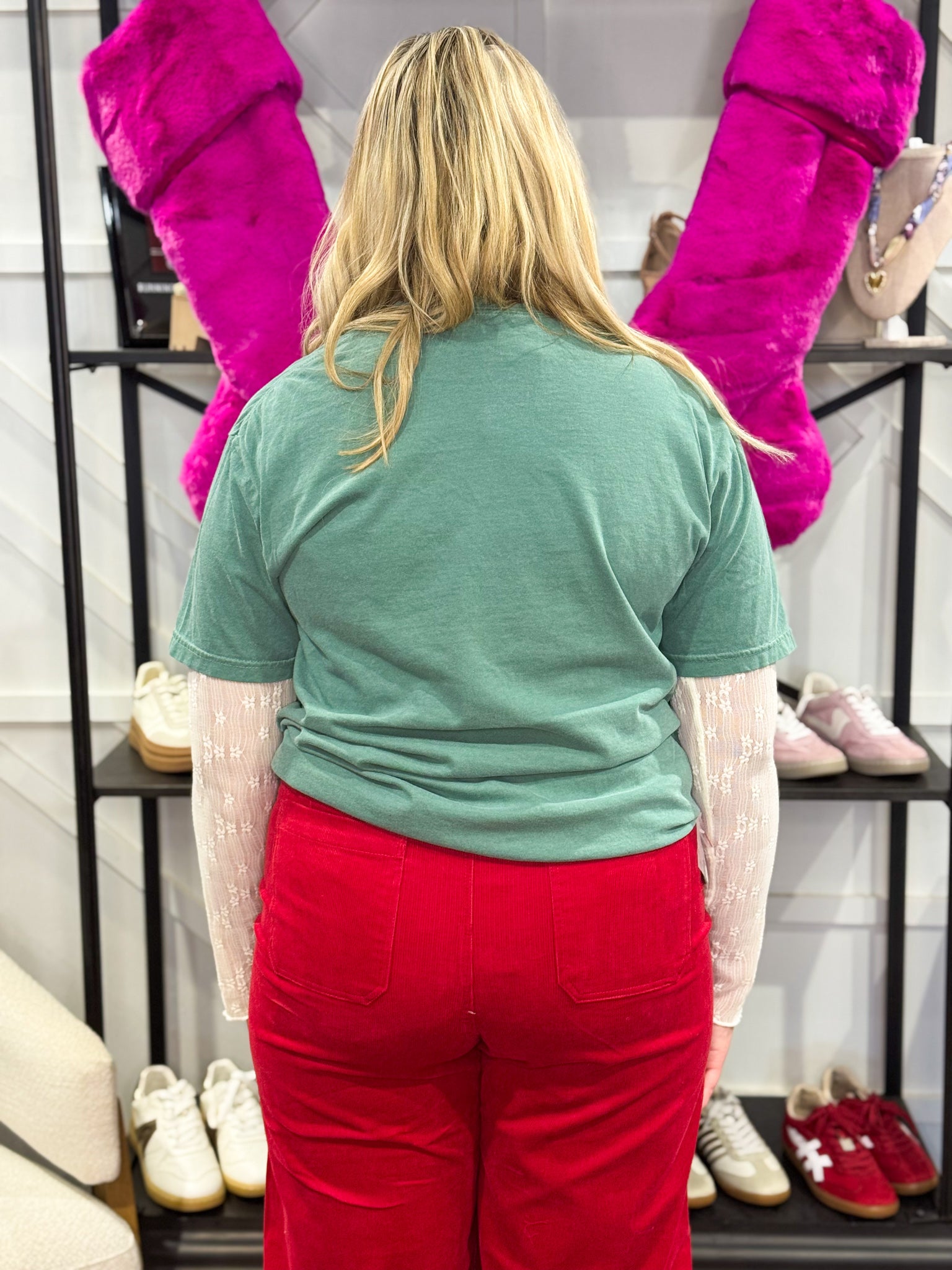 A green short sleeve t-shirt with ‘Merry & Bright’ in bold print on the front. Model is wearing size large.