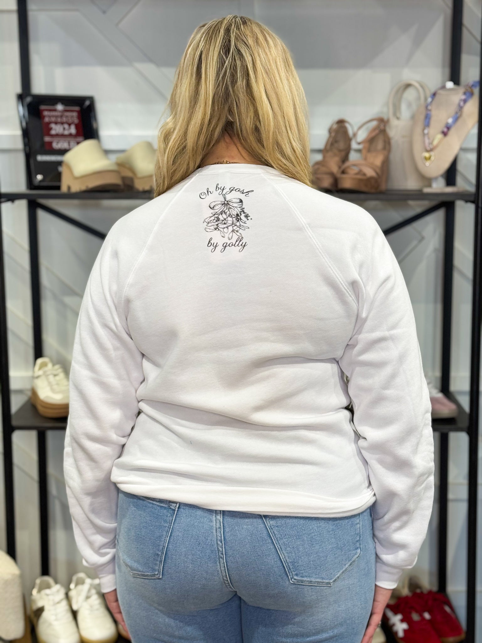 Classic white sweatshirt with ‘Nutcracker University’ design on the front. Model is wearing size large.