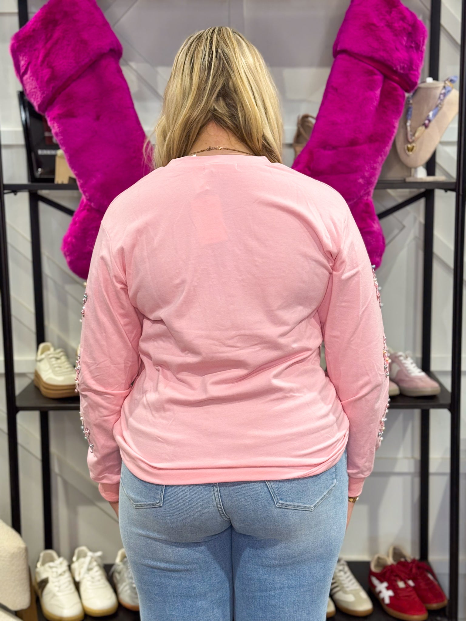 The sweetest light pink long sleeve t-shirt with round neckline. The t-shirt has pearl ‘Merry’ embroidered in the front of the shirt and snowflakes on the sleeves. Model is wearing size large.