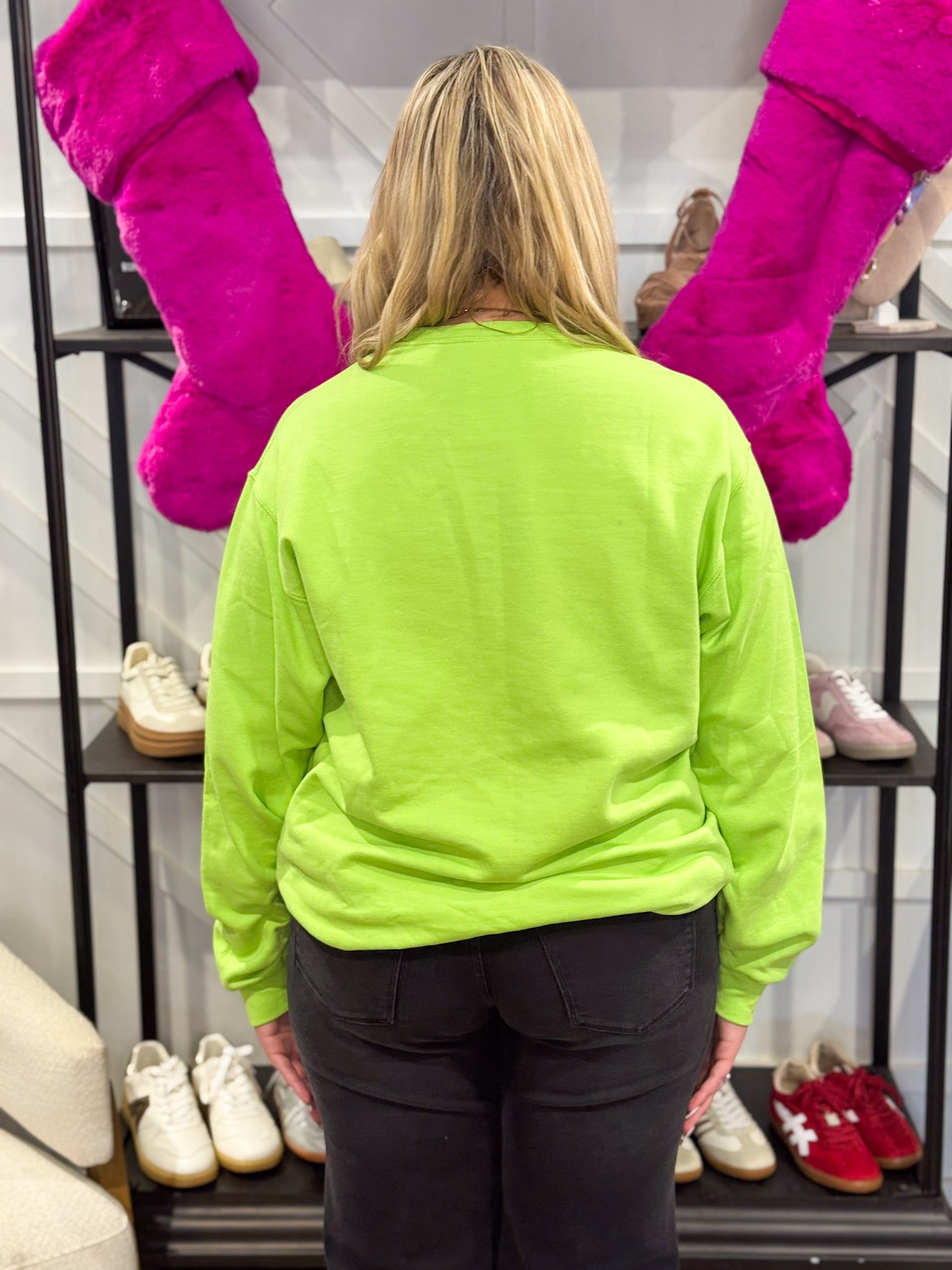 Lime green classic sweatshirt with round neckline and long sleeves. The sweatshirt has three polka dot trees on the front. Model is wearing size large.