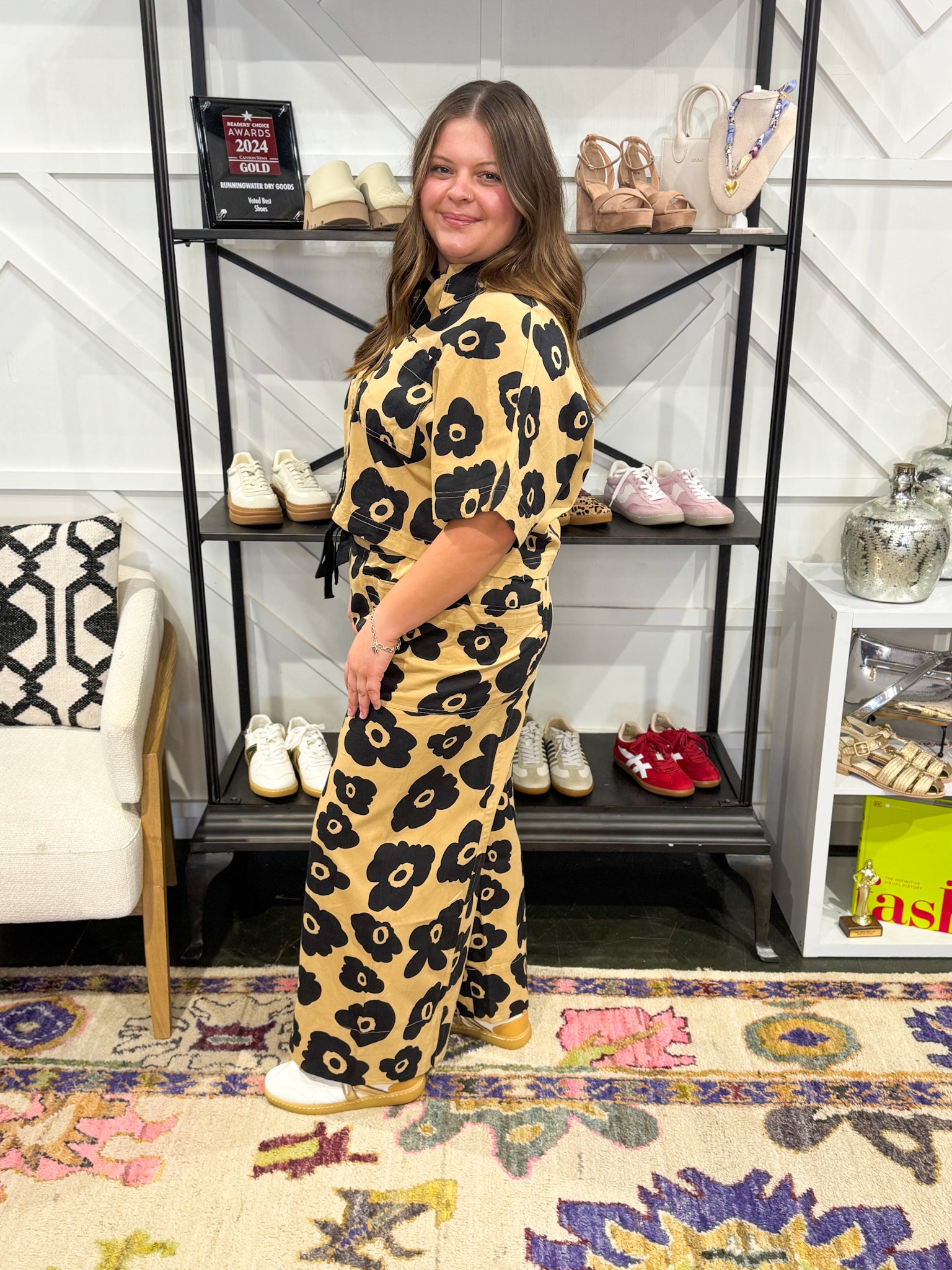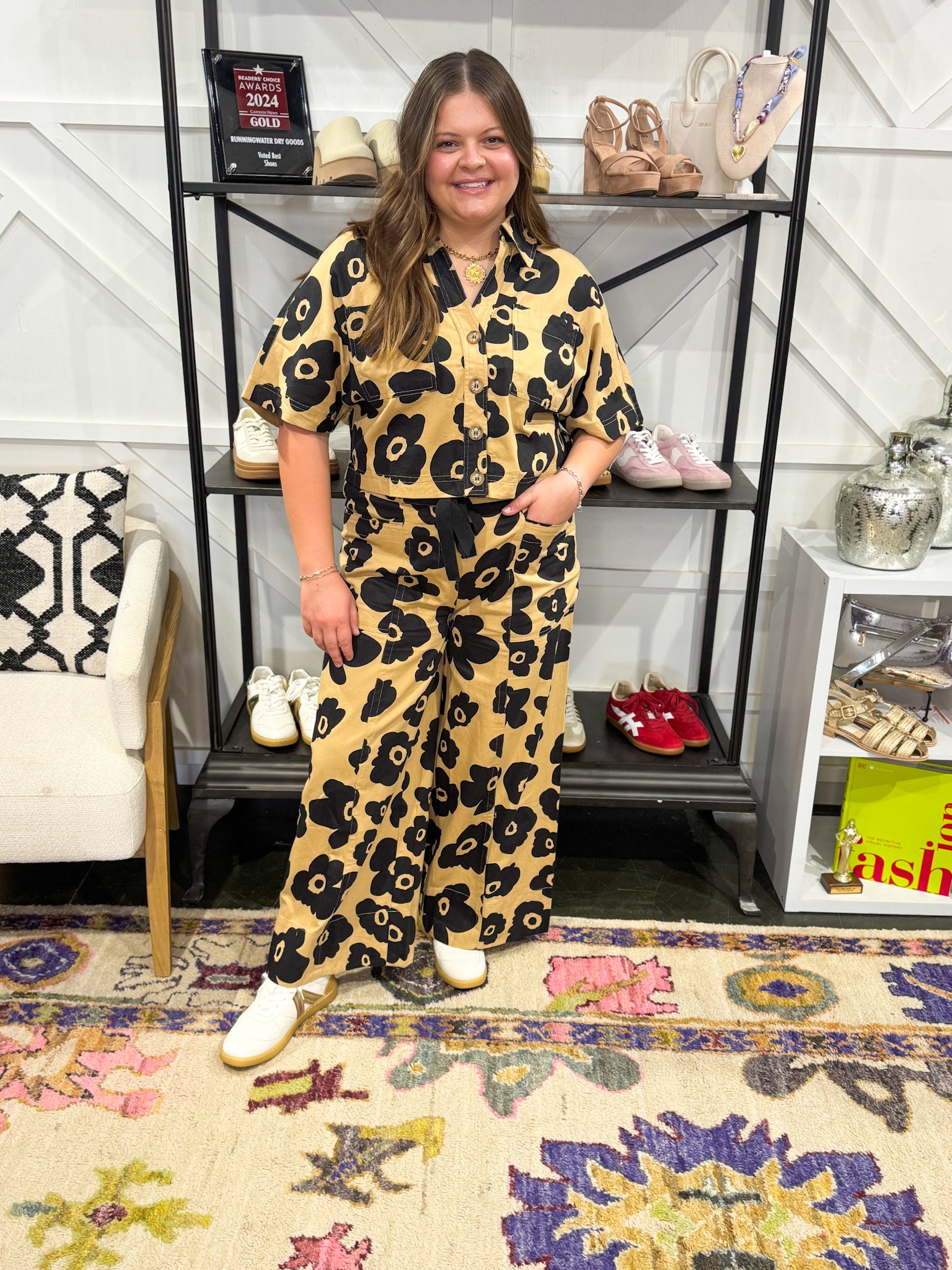 Black and tan floral printed outfit set. The top has short sleeves and buttons up the front with collar details. The pants are high waisted and have a tapered wide leg fit. Model is wearing size medium.