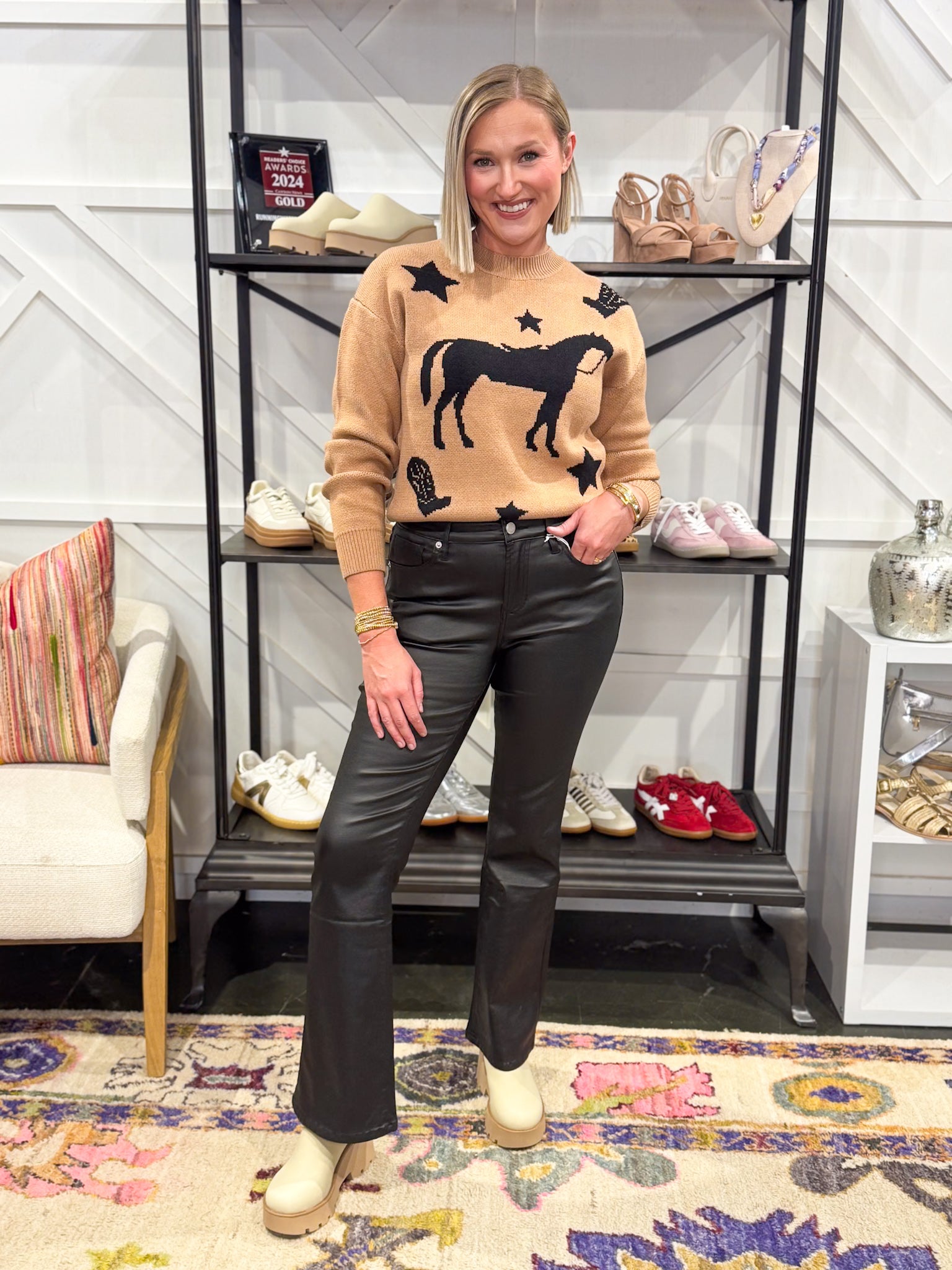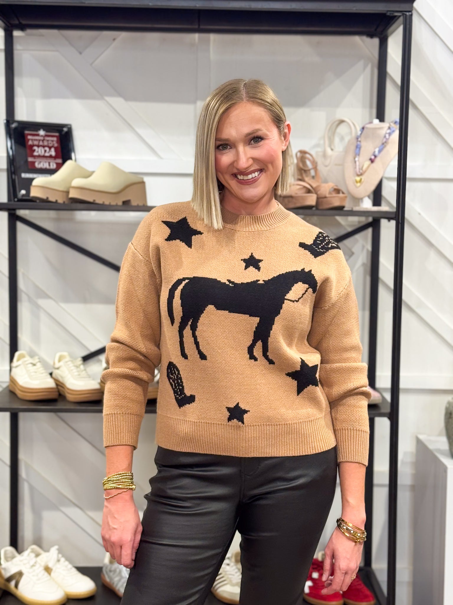 A soft tan knit sweater with a horse on the front. Model is wearing size medium.