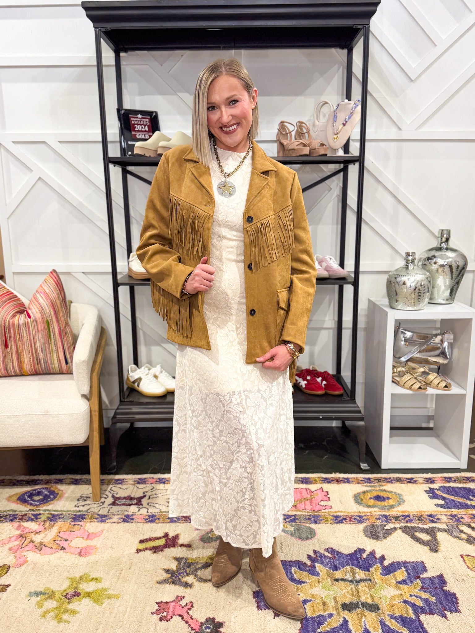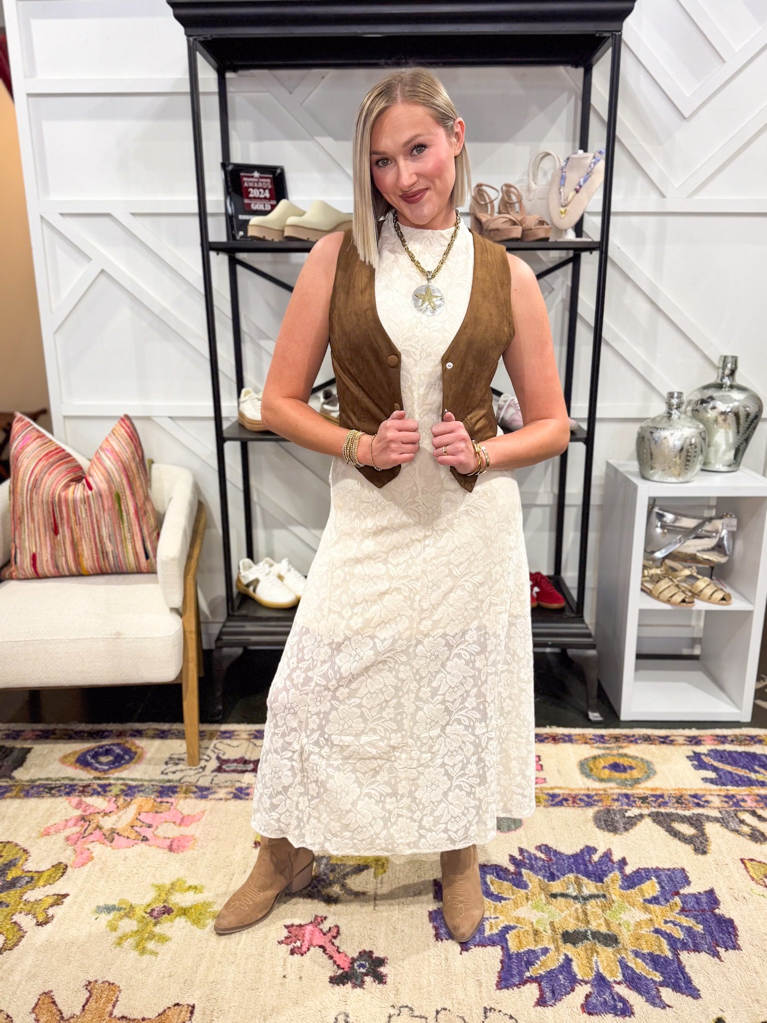 A gorgeous ivory colored, sleeveless, lace midi dress with a high neckline. Fit is true to size. Model is wearing size medium.